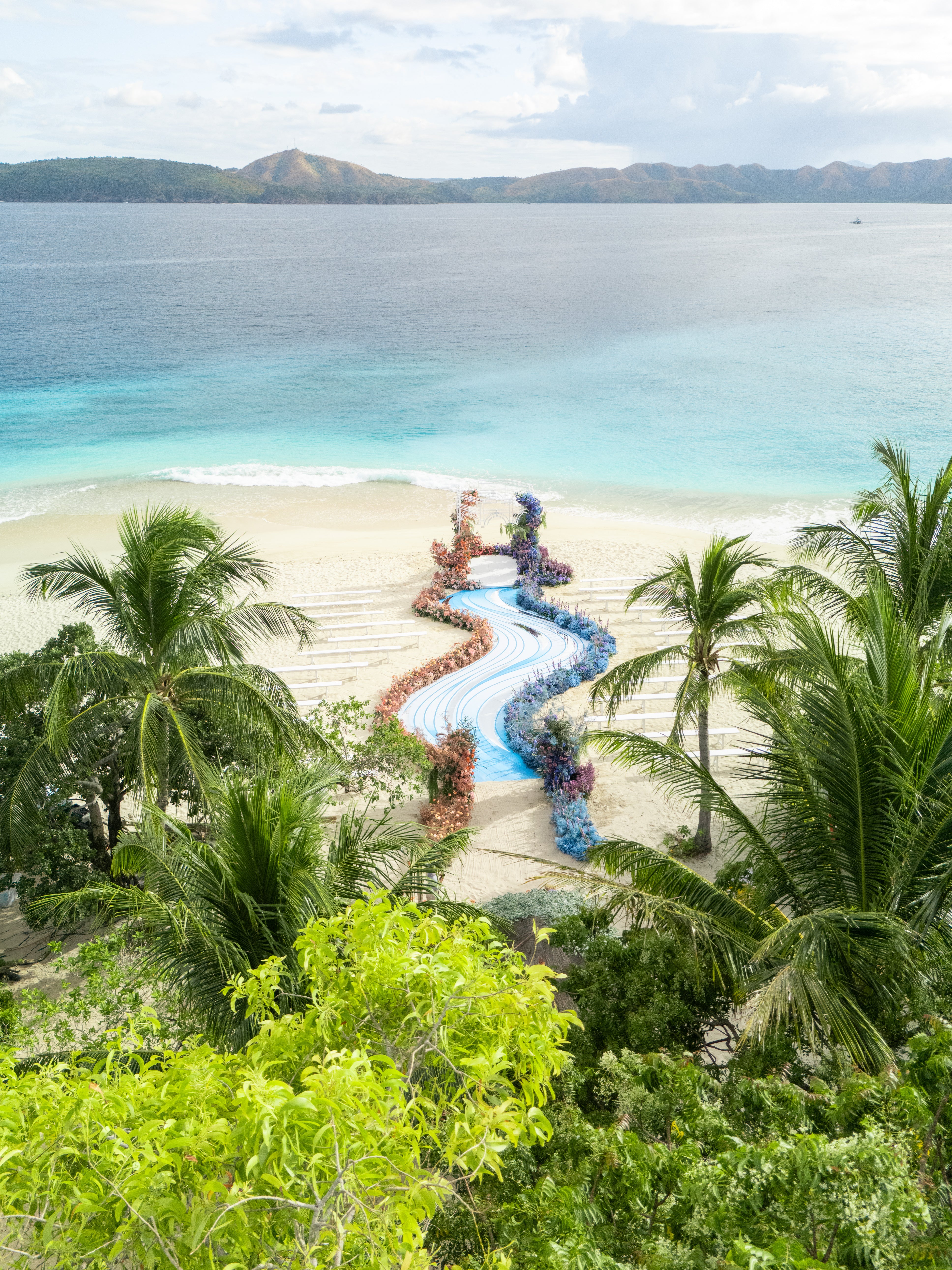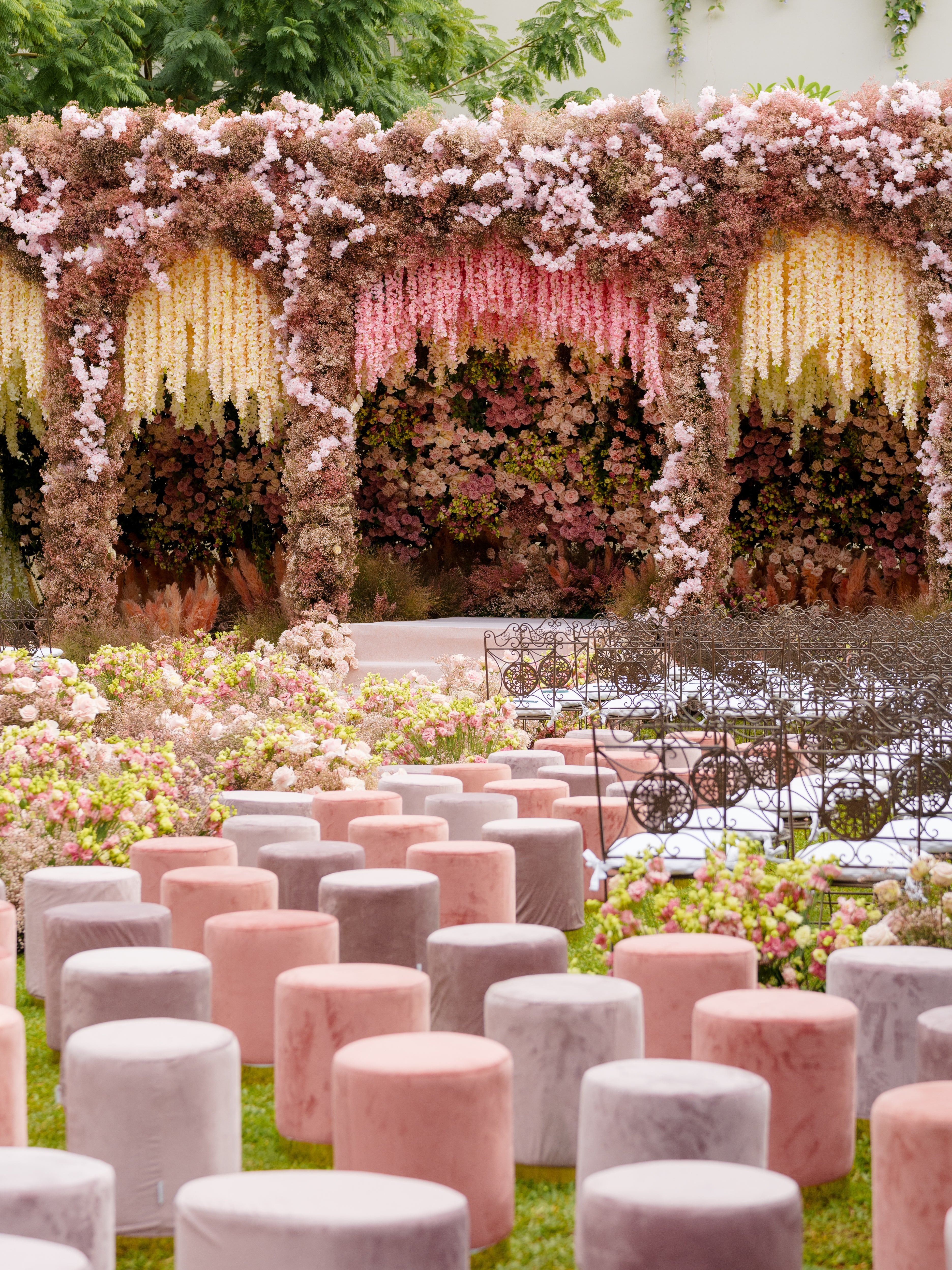 For couples who want to break away from straight lines and symmetry, the meandering aisle, or curved aisle, offers a soft, poetic entrance. Instead of walking a direct path to the altar, the aisle gently winds - often through lush floral installations, garden landscapes, or custom-designed curves - adding a sense of discovery and intimacy to the ceremony.