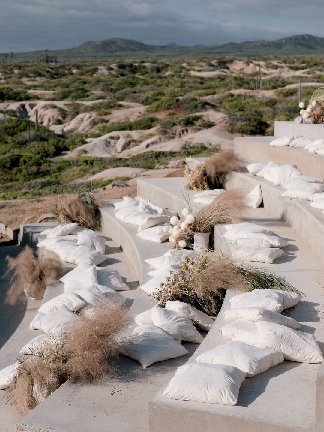 It’s a great way to blur the line between formality and ease, allowing guests to settle in, mingle before the ceremony, and experience the moment in a more connected way. Styling can range from boho to ultra-modern, depending on the furniture and layout used.