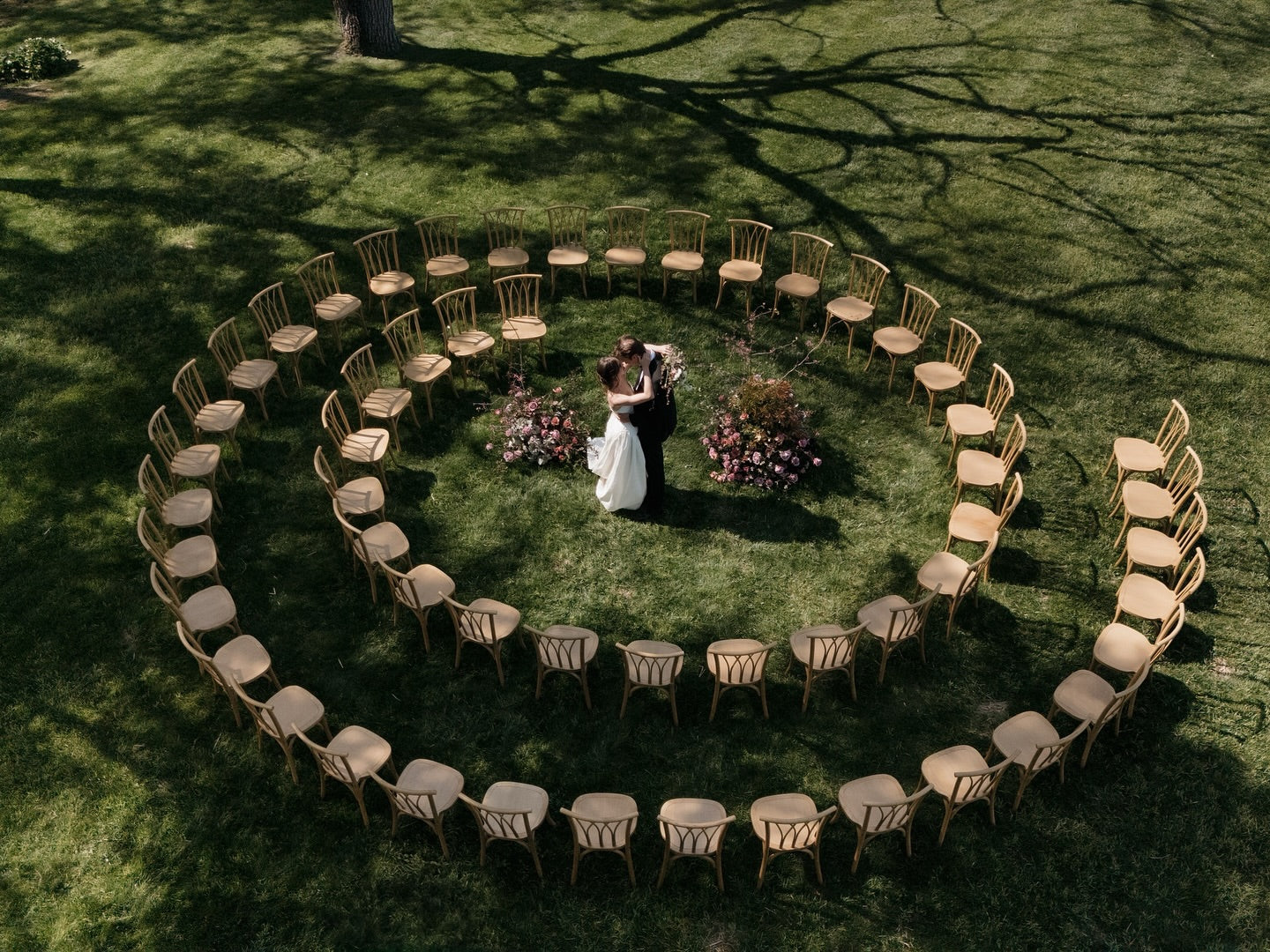 Seating guests in a full circle or semi-circle layout around the couple brings a beautiful sense of intimacy and symbolism - love at the center, community encircling it. This seating arrangement works especially well for smaller guest counts and allows everyone to feel close to the moment. Bonus: it looks stunning from every angle in photos!